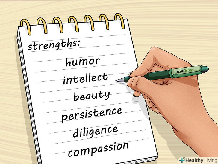 Складіть список своїх позитивних якостей. розрив відносин може негативно позначитися на вашій самооцінці. Якщо ви звинувачуєте себе за те, що трапилося, це може негативно впливати на вашу самооцінку. Тому виділяйте час, щоб подумати про хороші якості, якими ви володієте. Складіть список своїх сильних сторін і щодня нагадуйте собі про них. [4]- Якщо ви володієте хорошим почуттям гумору, інтелектом, привабливою зовнішністю, цілеспрямованістю, працьовитістю або вмієте співчувати іншим людям, внесіть ці якості в список.
