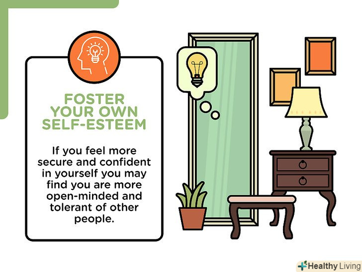 Виховуйте в собі здорову самооцінку. іноді люди, які страждають низькою самооцінкою або поганою думкою про себе, демонструють особливе неприйняття до інших. Подібне неприйняття-це всього лише відображення того, як вони відчувають по відношенню до самих себе. Якщо ви відчуваєте себе впевнено і безпечно, вам буде простіше терпимо ставитися до інших людей. [10]