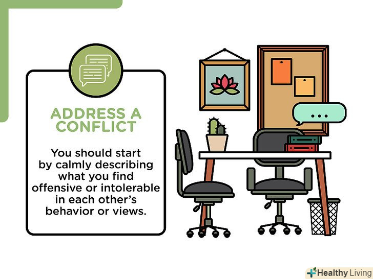 Звертайтеся до теми конфлікту. Якщо вам занадто важко проявити співчуття або ігнорувати конфліктну тему, і терпіти думку іншої людини вище ваших сил, необхідно звернутися безпосередньо до теми конфлікту, щоб прийти до якогось вирішення ситуації. Якщо ви хороші друзі, і вам не хочеться, щоб дана тема зруйнувала ваші відносини, потрібно докласти зусиль, щоб спільно виробити рішення. Всім, хто так чи інакше залучений в ситуацію необхідно докласти старання і взяти активну участь у вирішенні конфлікту.- Спочатку необхідно спокійно описати те, що ви вважаєте для себе образливим або неприйнятним, з точки зору поглядів або поведінки іншої людини. Наприклад:»я не згоден з твоїми поглядами на вільне носіння зброї".