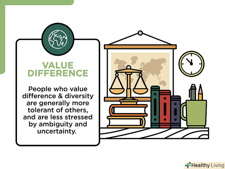 Цінуйте відмінності. важлива частина розвитку більш терпимих поглядів полягає в розвитку вміння сприймати і цінувати відмінності. Люди, які вміють цінувати відмінності, як правило, більш терпимі до інших, і набагато менше схильні до стресу через двозначність або невизначеність. Нетерпимість здатна легко і просто спростити і помістити у вузькі рамки весь цей складний і постійно мінливий світ, оскільки так їй простіше його сприймати, не звертаючи уваги на відмінності і складності.- Знаходячи більш відкритий погляд на світ і налаштовуючись вчитися у тих, хто відноситься до іншої культури і має інші уявлення про життя, ви стаєте більш терпимою людиною.