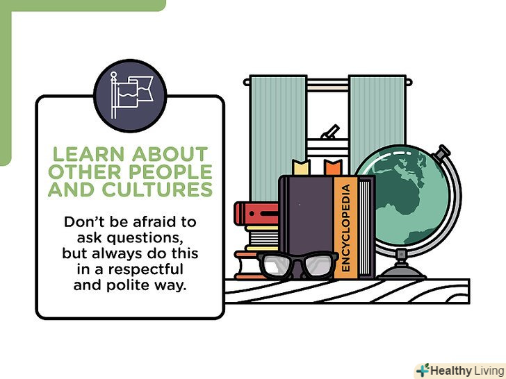 Вивчайте людей та інші культури. Хороший спосіб стати більш терпимою людиною-глибше вивчити відмінності в культурах і поглядах різних людей. Найчастіше люди виявляють недолік терпимості по відношенню до інших в силу того, що відчувають себе некомфортно і невпевнено щодо того, що відбувається, про що говорить ця людина або що він робить. Приділіть час вивченню особливостей інших культур і систем світогляду. Не бійтеся задавати питання, але робіть це завжди ввічливо і з повагою. [8]- Наприклад, можна вивчити різні способи святкування значущих життєвих подій.