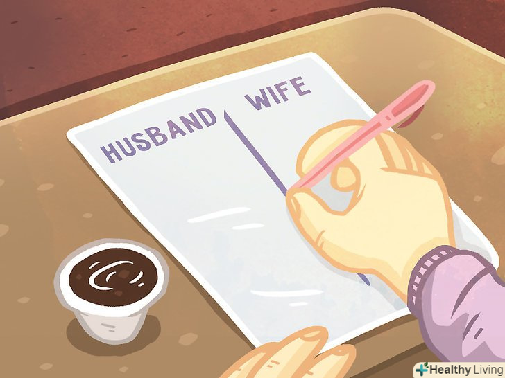 Складіть список дій, які можуть зберегти ваш шлюб. які дії вам необхідно зробити разом з чоловіком, щоб уникнути розставання? Розділіть аркуш паперу смугою по вертикалі і запишіть зліва свої дії, а праворуч — всі необхідні дії вашого чоловіка, які допоможуть врятувати шлюб. [8]- Наприклад, в колонці чоловіка можна написати: «частіше звертати увагу на мої почуття, частіше висловлювати любов і прихильність, спілкуватися ближче». У своїй колонці можна написати:»говорити більш добрі слова, не допускати особистих випадів, не замінювати особисте життя робочими цілями".