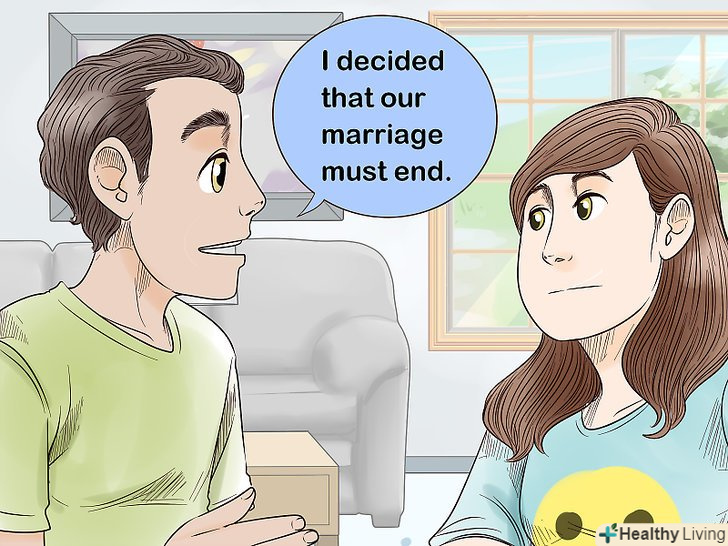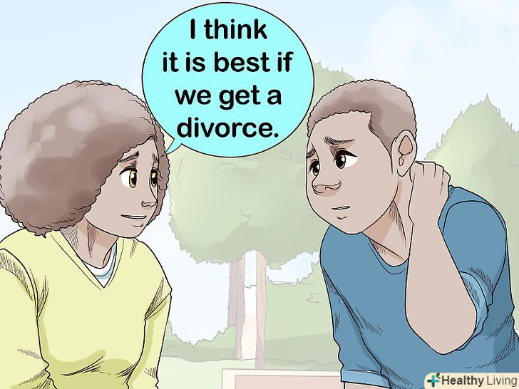 Повідомте про своє бажання розлучитися. Говоріть тактовно , але прямолінійно. Коротко і твердо озвучте своє рішення партнеру. Ні в якому разі не проявляйте коливання, особливо якщо впевнені, що хочете оформити розлучення. [3]- Можна сказати: «Я не думаю, що наш шлюб на щось годиться. Я вважаю, буде краще, якщо ми розлучимося».