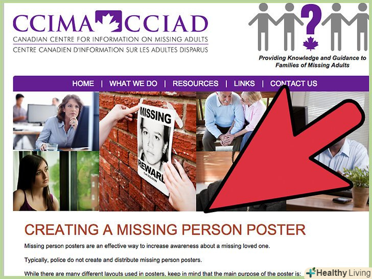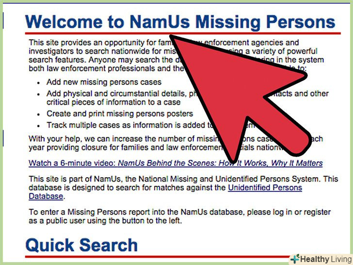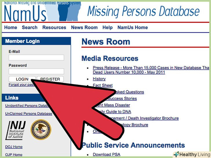 Зареєструйтеся на сайті зниклих безвісти людей. створіть обліковий запис у базі даних відсутніх людей, таких як NAMUS. Ця база даних також відома як національна система зниклих і непізнаних людей і являє собою сайт, що фінансується урядом Сполучених Штатів, який дає можливість правоохоронним органам і звичайним людям додати особисту справу потрібного вам людини або простежити за особистими справами всіх зниклих безвісти людей. [16] [17]