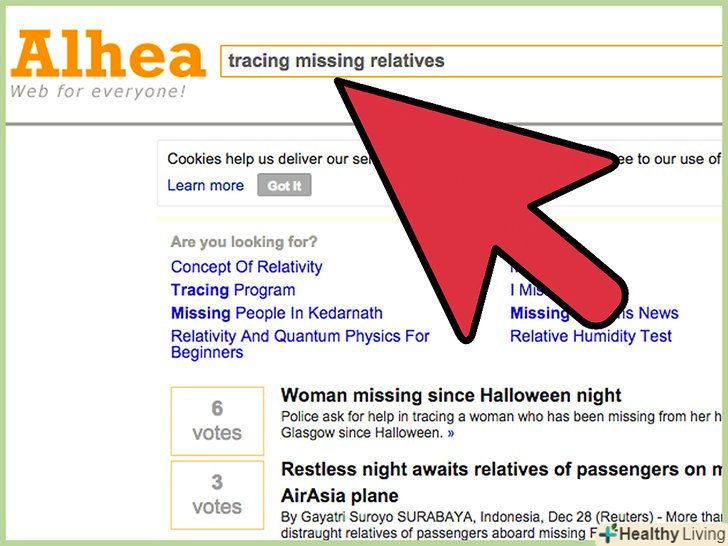 Пошукайте інформацію в Інтернеті за допомогою пошукача. для початку використовуйте популярні пошуковики, такі як Google, Bing або Yahoo. Введіть відомі вам подробиці про зниклу людину, наприклад, ім'я, вік, штат (точно відомий або можливий) і спеціальність. В університеті Буффало можна знайти Бібліотечний список кращих пошуковиків для пошуку інформації та людей в Інтернеті. [3]