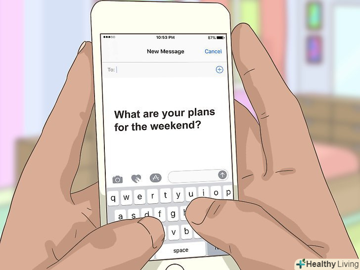 Задайте людині питання. Якщо ви задасте питання в першому повідомленні, це допоможе вам закинути вудку, і людина або відповість, або проігнорує вас. Якщо він задасть своє питання, обов'язково дайте відповідь. [2]- Можна запитати що-небудь просте, наприклад: "які у тебе плани на вихідні?"- або: "яка на тобі сьогодні була взуття? Я хочу підібрати собі таку ж пару".