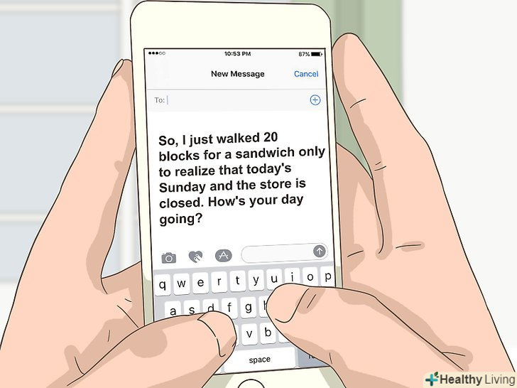 Не бійтеся бути собою. не сумнівайтеся в кожному повідомленні, яке ви хочете відправити. Якщо ви виявите, що друкуєте довгі тексти і видаляєте їх, зупиніться і постарайтеся розслабитися. Чим більш невимушено ви будете себе вести, тим менше тиску ви будете відчувати при майбутніх розмовах. Будьте самим собою, і не потрібно ретельно аналізувати все те, що збираєтеся сказати. [9]