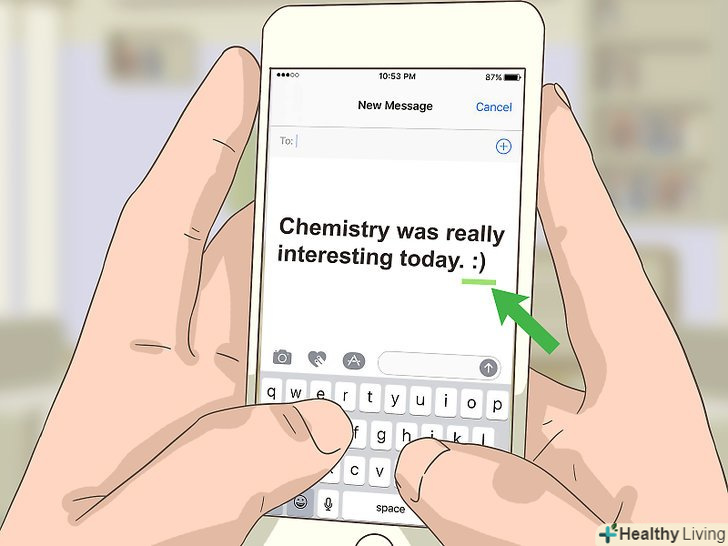Частіше використовуйте смайлики. Смайлики корисні, тому що людина, якій ви пишете, не може бачити ваше обличчя або оцінювати ваш настрій. Такі речі, як сарказм, іноді можуть губитися при листуванні, тому смайлики допоможуть прояснити, що ви насправді відчуваєте. Не перестарайтеся і не замінюйте смайликами кожне слово — далеко не кожному це припаде до вподоби. [4]- Можна сказати що-небудь на кшталт: «Урок хімії сьогодні був дуже цікавим:)».