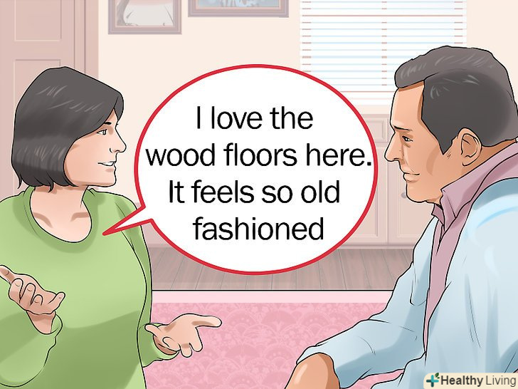 Використовуйте навколишнє оточення, щоб зав'язати розмову. спробуйте попрацювати з тим, що є. Якщо ви не знаєте, що запитати або яку тему вибрати, прокоментуйте навколишнє оточення. Озирніться по сторонах і почніть розмову, виходячи з цього. [5]- Наприклад, можна сказати: "мені подобаються ці дерев'яні підлоги. Вони ніби переносять в іншу епоху"»