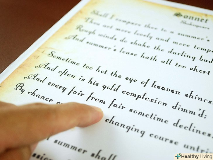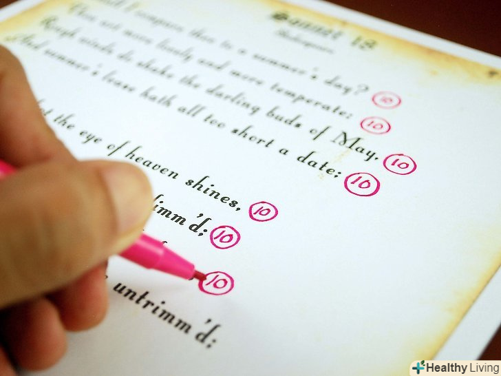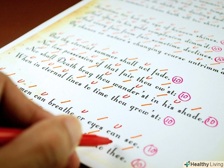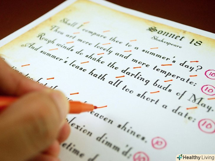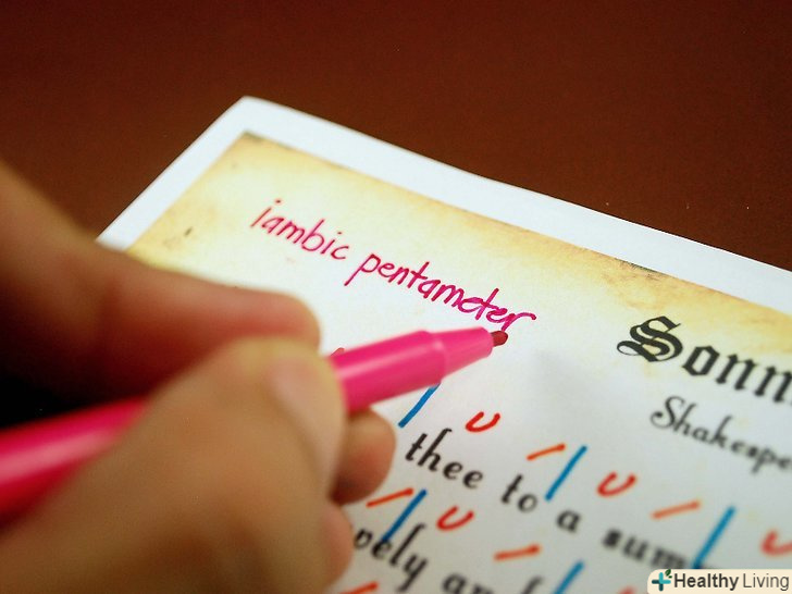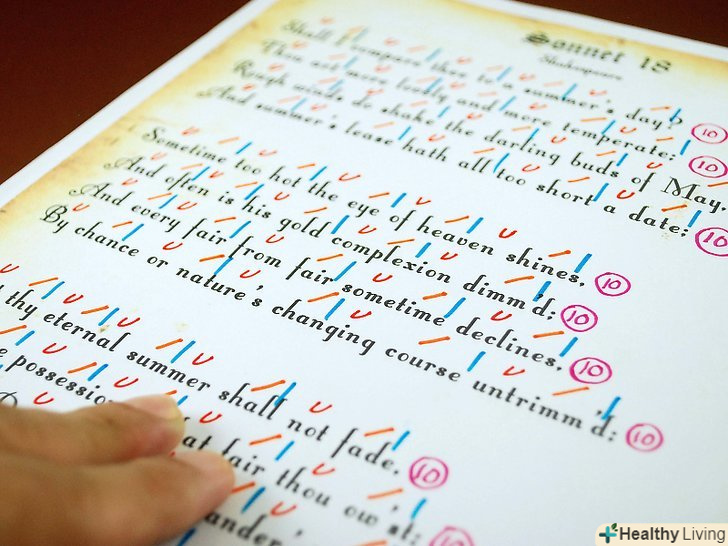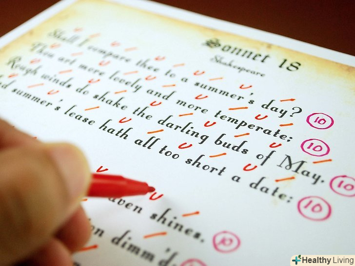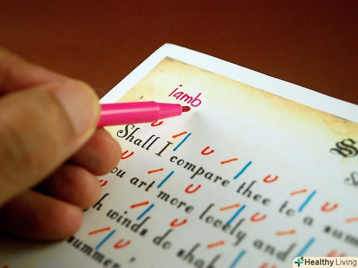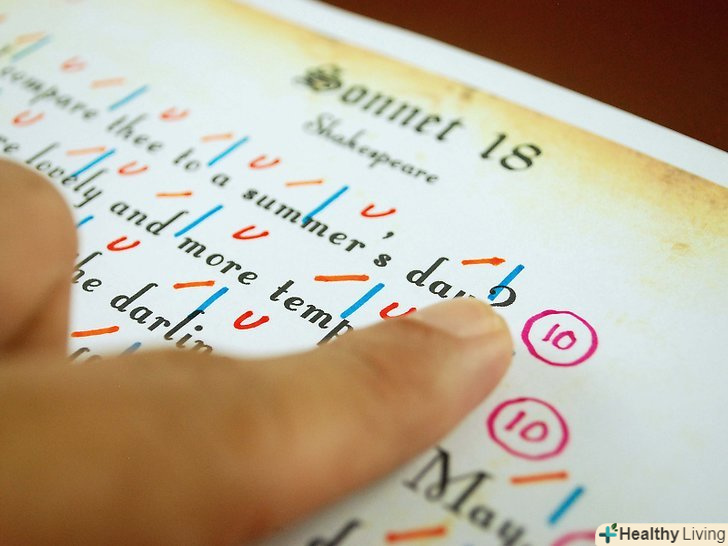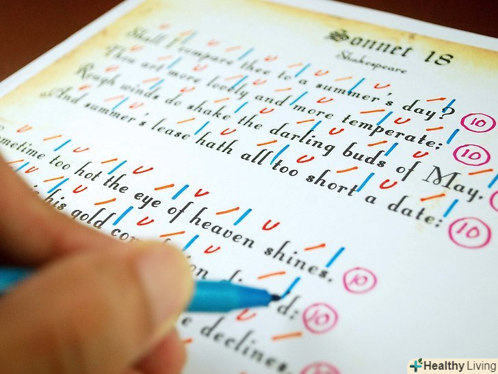 Визначте, чи не є ваш вірш сонетом: якщо в ньому 14 ліній, і він володіє виразною схемою римування. Визначте, чи написаний вірш п'ятистопним ямбом, потім виконайте наступні кроки. Якщо ні, він все ще може мати ямбічний метр, який є найпоширенішим розміром для віршів замкнутої форми.