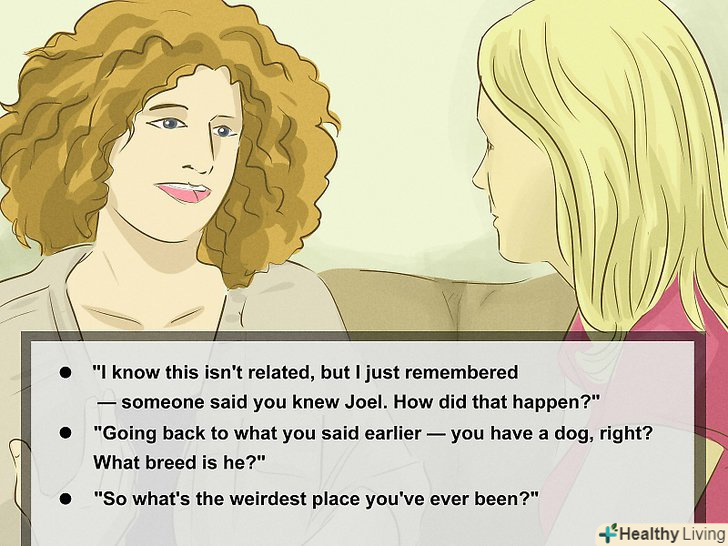 Запам'ятайте кілька основних фраз для початку розмови. Не потрібно володіти розмовними навичками світового класу, щоб добре поговорити з кимось. Досить запам'ятати кілька простих питань, які можна використовувати, щоб уникнути незручних пауз. [1]- Запитайте нового знайомого, звідки він, як познайомився з вашим спільним другом і чим зазвичай займається у вільний час.