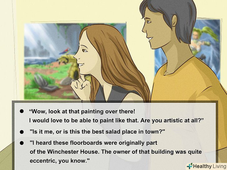 Зробіть якийсь безпечний коментар. в даному випадку можна сказати про щось, пов'язане з місцем вашого знаходження. Наприклад, якщо виникло мовчання, ви можете сказати: "Ого, подивіться на ту картину. Хотів би і я вміти так малювати. А ви? Ви любите мистецтво?” [9]- Якщо ви обідаєте разом, можна сказати щось про їжу, наприклад: "мені здається, чи тут подають найкращі салати в місті?"Подібна постановка пропозиції не тільки порушує тишу, але і дає вашому співрозмовнику можливість висловити свою думку.