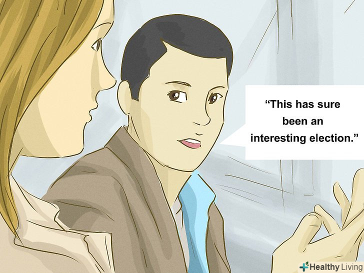 Знайдіть загальний тон. дуже часто незручні паузи виникають в результаті недоречного коментаря. Якщо ви не впевнені, що співрозмовник оцінить ваш специфічний гумор, то утримайтеся від жартів, поки не будете на 100% впевнені, що гумор зрозуміють. [10]- Щоб знайти той самий загальний тон, спробуйте зробити легкий, пробний коментар і подивіться, як відреагують люди. Наприклад, якщо ви хочете обговорити політику, скажіть щось на кшталт: "Це, без сумніву, були дуже цікаві вибори". Можливо, таким чином, співрозмовники розкажуть про свої погляди на ці події, і ви зможете зрозуміти, чи сподобаються їм ваші жарти про кандидатів або ж навпаки, образять їх.