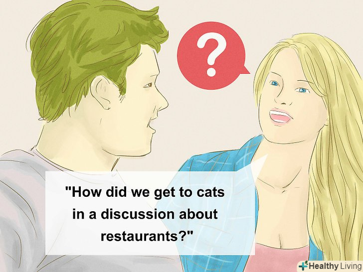 Знайдіть зв'язок між темами бесід. якщо у вас виникла дуже хороша і насичена розмова, і ви раптово зайшли в глухий кут, озирніться і з'ясуйте, яким чином ви дійшли до розмови про котів, якщо насправді все починалося з місцевих ресторанів. Можливо, головним зв'язком між цими темами є ваш спільний знайомий, з яким ви недавно ходили в кіно. Це може викликати палку розмову про фільми та телевізійні шоу, що в кінцевому підсумку призведе до книг та музики.