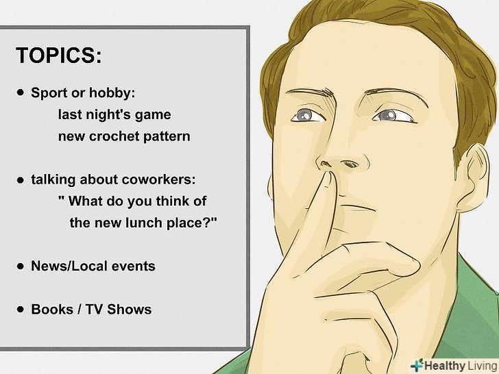- Якщо розмовляєте з колегами, подумайте про теми, пов'язані з роботою, але не з самим процесом. Наприклад, можна запитати: “що ви думаєте про нашу нову їдальню?”