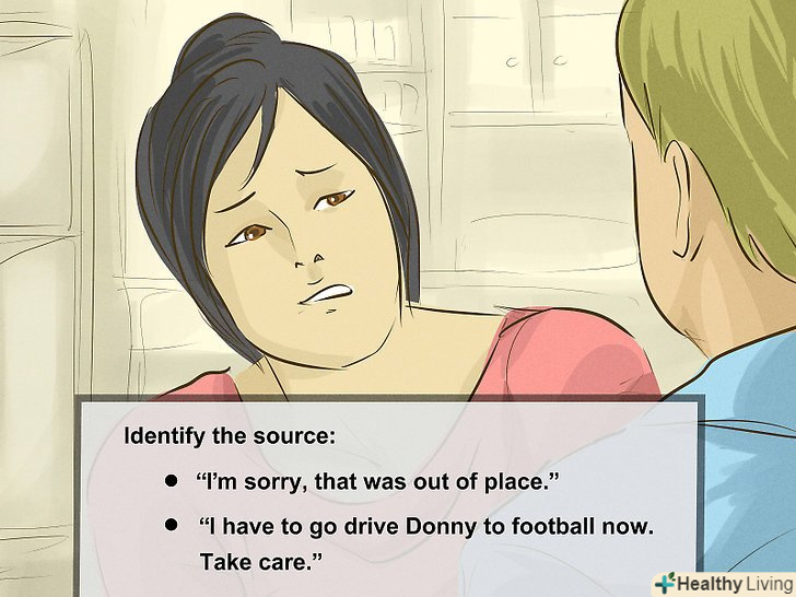 Визначте джерело. завжди існує щось, що стало причиною незручного мовчання. Якщо ви з'ясуєте цю причину, вам легше буде впоратися з самою проблемою. Можливо, хтось сказав щось, через що інша сторона відчуває себе некомфортно. Можливо, у вас абсолютно різні погляди в певній ситуації, і ви обидва уникаєте конфлікту. Або у вас просто не так багато спільного, про що можна б було поговорити. Залежно від ситуації, ви завжди можете відповісти відповідним чином і рухатися далі. [15]- Навіть якщо ви сказали щось, що поставило іншу людину в незручне становище, ви завжди можете вибачитися, сказавши щось на кшталт "Вибачте, це було недоречно" і перевести розмову в нове русло.