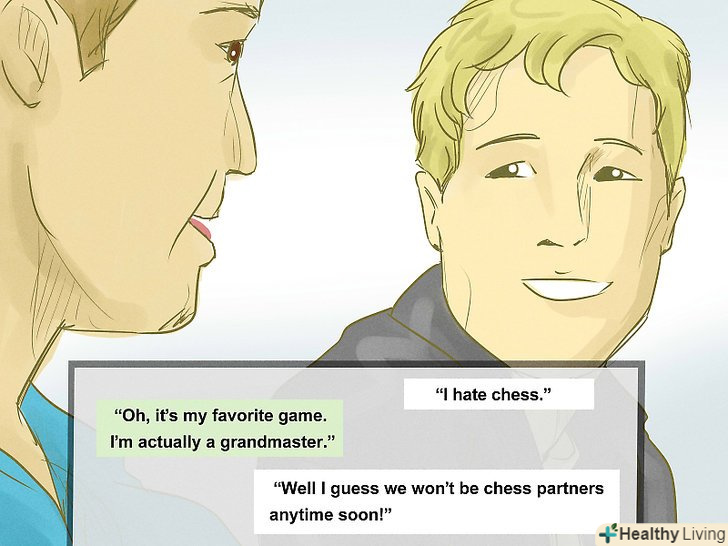 Визнайте незручний факт. це допоможе у випадку, якщо розмова припинилася через те, що один з вас сказав щось бентежне, грубе або недоречне. Наприклад, якщо ви п'ять хвилин говорили про те, як ви ненавидите шахи, а потім ваш співрозмовник відповідає: “О, це моя улюблена гра. Я, якщо чесно, гросмейстер". Щоб уникнути незручності в даній ситуації, можна сказати: "Ну, думаю, найближчим часом ми навряд чи станемо партнерами з шахів". Після цього поміняйте тему розмови на обговорення якогось загального інтересу. Або запитайте, які інші види спорту подобаються вашому співрозмовнику. [16]- А якщо, обговорюючи своє відмінне вчорашнє побачення і майбутнє цього вечора побачення одного, ви з'ясували, що обидва зустрічаєтеся з одним і тим же людиною, повисне така тиша, що хоч ножем ріж. Все, що ви можете зробити, щоб хоч трохи розсіяти напругу, це до того, що сталося поставитися з гумором і просто сказати: “Ой, як ніяково вийшло!”