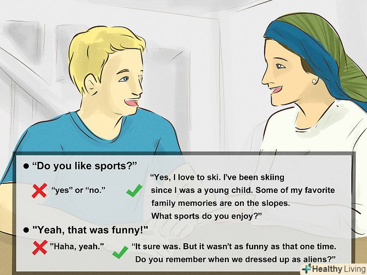 Дуже уважно слухайте свого співрозмовника і відповідайте відповідним чином. як і в будь – якій хорошій бесіді, головне-вміння слухати. Якщо на ваше запитання відповідають коротким "так" або "ні", це може означати, що вашому співрозмовнику не дуже комфортно обговорювати ту чи іншу тему. Краще поговоріть про те, що напевно буде йому цікаво. Наприклад: "я чув, що минулого вечора ви виграли хокейний матч. Із задоволенням послухав би про це". [11]- Також звертайте увагу на мову тіла співрозмовника. Якщо він схрещує руки на грудях, нервово совається або дивиться в підлогу, то, можливо, тема розмови йому не зовсім комфортна. Подібна мова рухів тіла буде цінною підказкою до того, що потрібно змінити тему.