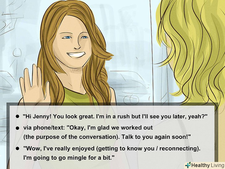 Витончено завершіть розмову. бесіди не тривають вічно, тому немає нічого ганебного в тому, щоб закінчити розмову. Якщо ви часто застряєте в безглуздих бесідах або вам ніяково прощатися, подумайте про можливі фрази, які можуть допомогти в цьому.- Наприклад, якщо ви натрапили на знайомого десь в громадському місці, можна сказати: "Привіт, Женя! Відмінно виглядаєш. Я трохи поспішаю, Побачимося пізніше, добре?”