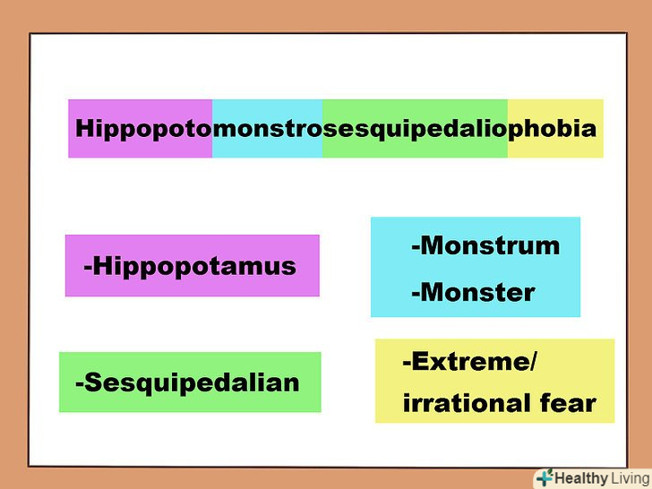 Розділіть слово на кореневі слова. Гиппопото-монстро-сесквипедалио-фобія . Гиппопото - це спотворене слово гіпопотам , монстро походить від латинського monstrum і означає монстр , сесквипедалио походить від англійської sesquipedalian , що перекладається як дуже довге слово, тоді як фобія - це надмірний або ірраціональний страх.