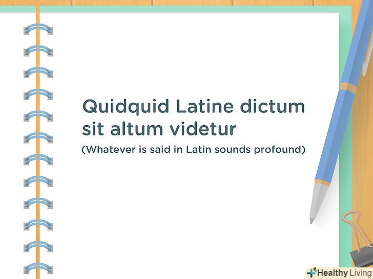 Розбавляйте свою прозу фразами з інших мов. у багатослівності правдива одна річ:" Quidquid Latine dictum sit altum videtur " (те, що сказано на латині, звучить глибокодумно). Завчіть кілька хороших латинських фраз і вставляйте їх куди тільки можна. Підмішайте в мову ще трохи англійської або французької, підкреслюючи вимову, і ви станете віртуозом чотирьох мов.- Ніж говорити: "він звик використовувати приховані відсилання", краще скажіть:" Його modus operandi здається obscurum з obscurius", щоб надати своєму вислову інтернаціонального колориту.