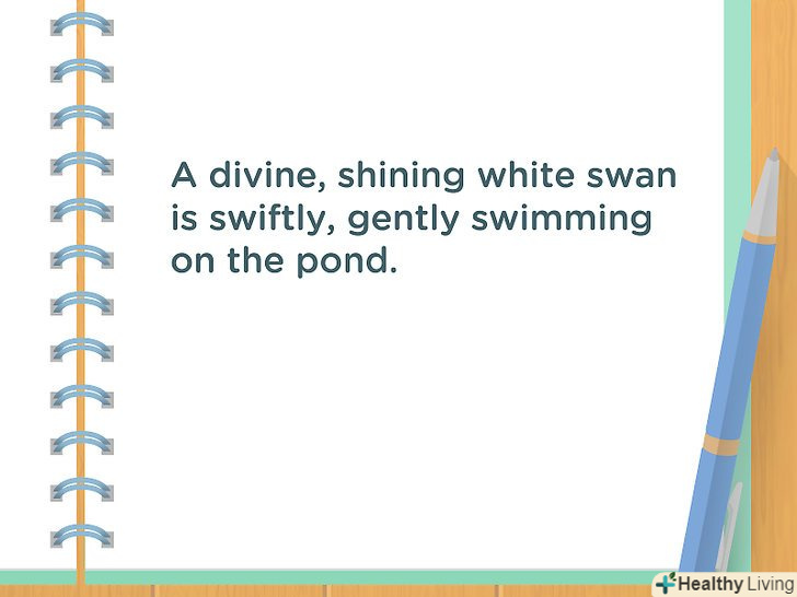 Використовуйте численні, різноманітні та різні прикметники. щоб сказати, що письменник або оратор багатослівний, потрібно, щоб для нього одне точне прикметник ніколи не замінювало п'ять непогано підходящих, середніх, стерпних, не зовсім точно відображають суть, хитких прикметників, нагромаджених в купу. Багатослівність означає, власне, багато слів. Вдавайтеся в надлишкове опис кожного іменника в своїй промові і ви будете на правильному шляху.- Але й не нехтуйте причастями. Якщо Лебідь пливе, то він повинен "плисти швидко, легко". Подумайте про кожну пропозицію як про різдвяну ялинку, яку ви хочете прикрасити. [1]