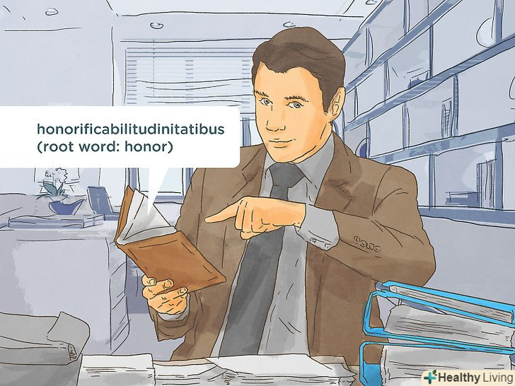 Вивчайте коріння слів. знаючи коріння, вам буде набагато простіше розрізняти значення незнайомих слів, що допоможе вам вибудувати практично нескінченний словниковий запас. Ще ви зможете створювати неологізми, або нові слова, на основі існуючих визначень.- Якщо ви знаєте достатньо суфіксів і префіксів, можна складати власні велетенські слова. Наприклад, такий перл як" превисокомногорассмотрітельствующій "починався з самого звичайного слова"дивитися".