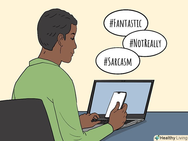 Помічайте в листах, повідомленнях і публікаціях хештег сарказм. важко розпізнати сарказм у соціальних мережах, але іноді очевидним показником є хештег. Крім сарказм нерідко використовують варіанти неправда і фантастика. [15]- Фраза " Давайте весело проведемо цей тиждень!"може здатися щирою, але хештег сарказм змінить значення слів.