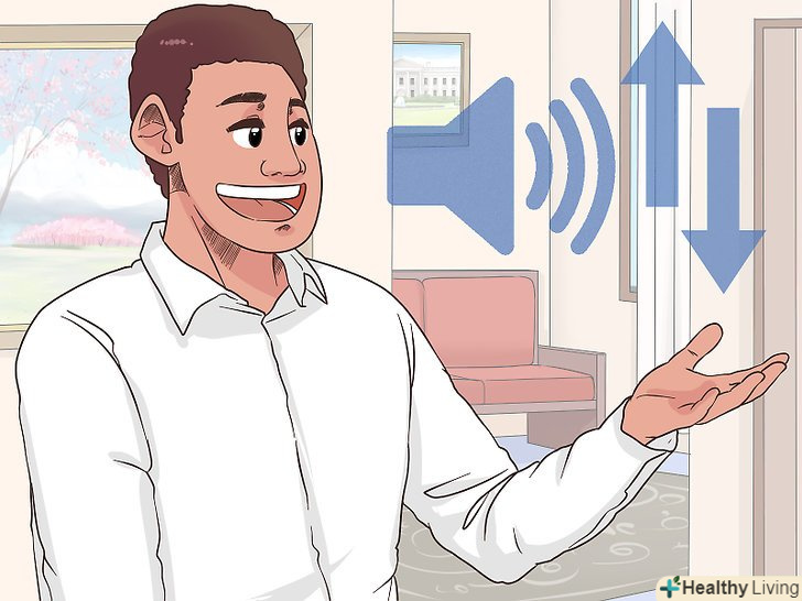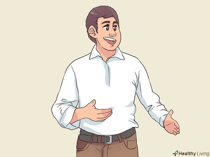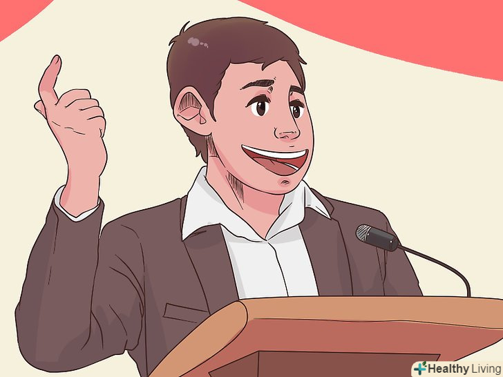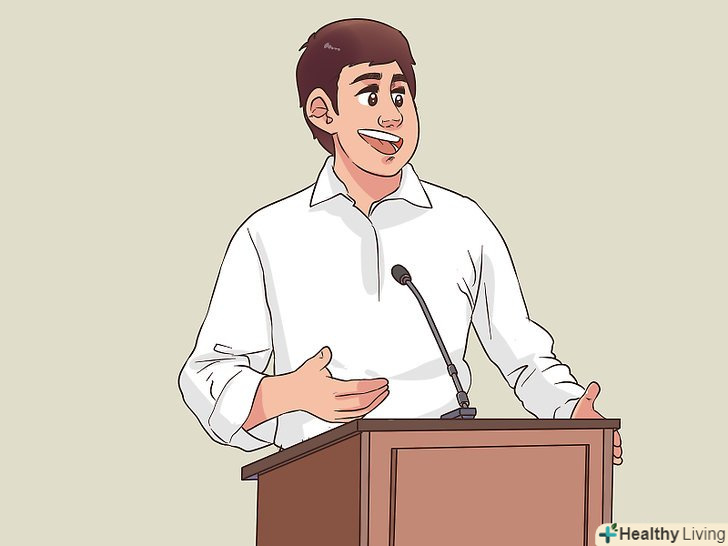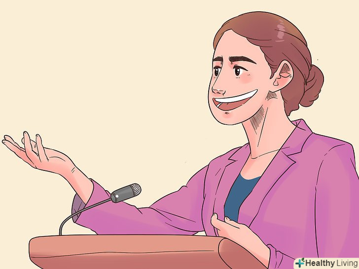 Задійте жести, щоб підкреслити важливі моменти. це можуть бути навмисні рухи рук і ваші рухи на сцені. Наприклад, перераховуйте на пальцях конкретні пункти з переліку або опустіть руку вниз, щоб підкреслити думку. Жести повинні бути природними для вас, інакше вони будуть виглядати награно. [13]- Уникайте випадкових жестів, які видають хвилювання. Кожен жест повинен бути використаний навмисно, а не в результаті занепокоєння. [14]