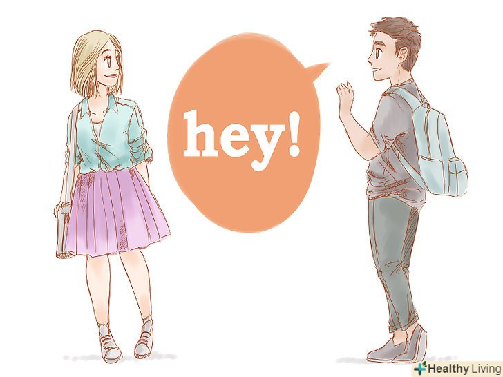 Дружелюбно привітайте людину. Якщо це хтось, з ким ви вже знайомі, просто скажіть "Привіт" і привітайтеся з ним або з нею, назвавши по імені: "Здрастуй, Марина, радий бачити тебе". Це просто і зрозуміло, і дає людині зрозуміти, що ви зацікавлені в розмові. Якщо ви незнайомі, Представтеся першими, щоб відчувати себе більш впевнено в розмові і контролювати його. Просто скажіть: "Привіт, я Сергій, а як тебе звуть?"Повторіть ім'я людини, коли він представиться, щоб він відчув себе особливим.- Не забувайте посміхатися і звертати свою увагу на людину, коли вітаєтеся. Не поводьтеся так, ніби просто вбиваєте час, поки не прийдуть ваші "справжні" друзі.