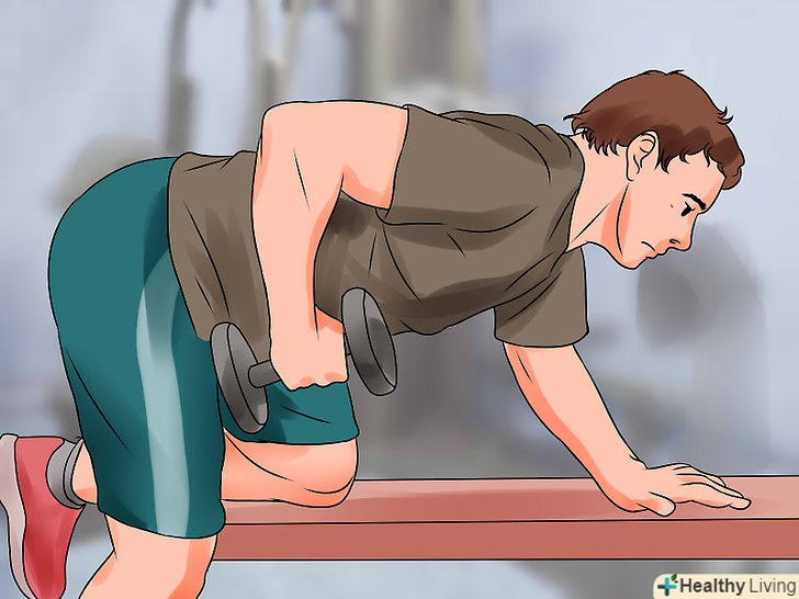 Силова підготовка. силові вправи слід виконувати не рідше двох разів на тиждень. [7] вони важливі навіть в тому випадку, якщо у вас немає мети наростити м'язову масу. Необхідно замінити жир м'язами, щоб схуднути. Згодом дані вправи допоможуть зміцнити і збільшити м'язи. [8]- Жим від грудей. Спочатку необхідно лягти на спину на твердій поверхні. Зігніть ноги в колінах. Візьміть в руки гантелі. Утримуйте їх на рівні грудей з зігнутими ліктями, а потім виштовхуйте вгору. Знову опустіть гантелі до рівня грудей. Виконайте 6-8 повторень і зробіть паузу перед наступним підходом. [9]