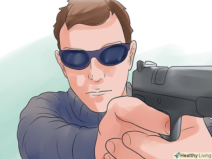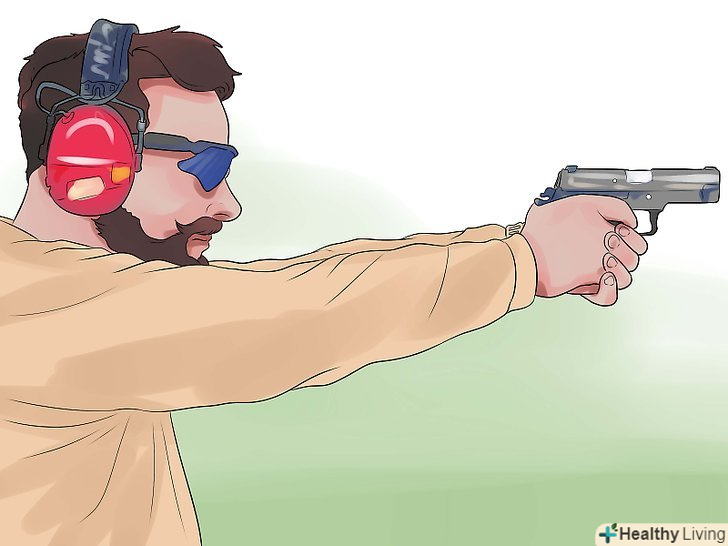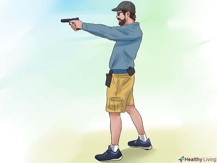 Встаньте в правильну для стрільби стійку. Ноги на ширині плечей; нога, протилежна робочій руці, на крок позаду іншої ноги. Злегка нахиліться вперед, зігнувши коліна, і переконайтеся, що ви прийняли стійке положення. Лікоть вашої робочої руки повинен бути майже повністю випрямлений, тоді як лікоть іншої руки повинен бути трохи зігнутий.- Деякі Стрілецькі вправи проводяться з використанням тільки однієї руки. В цьому випадку стійка більш "відкрита": рука зі зброєю і тіло складають кут в 90 градусів, стопи спрямовані по лінії вогню. Тут необхідний дуже міцний хват, так як зброя тримає тільки одна рука.