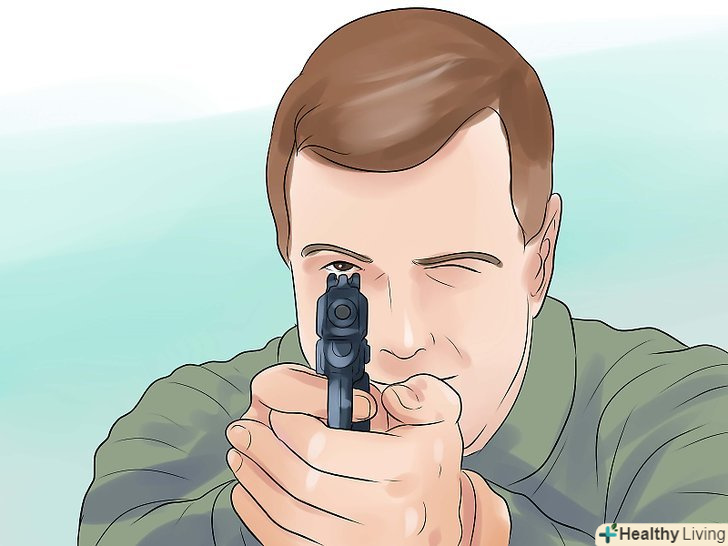 Навчіться правильно фіксувати погляд. основним ускладненням при стрільбі є вибір точки, на якій фіксується погляд. Мішень? Прицільні пристосування? Для правильної стрільби вершина мушки є основною точкою фіксування погляду. Фіксуючи погляд на вершині мушки, цілик і мішень будуть видні нечітко; проте, така фіксація погляду забезпечує найбільш точну стрілянину.- Для точної стрільби, вершина мушки повинна бути поєднана з точкою прицілювання. Іншим способом є поєднання вершини мушки з нижнім краєм мішені, тоді як точка прицілювання залишається вище. Обидва варіанти придатні; однак необхідно знати, як пристріляно зброю (під який спосіб відрегульовані його Прицільні пристосування).