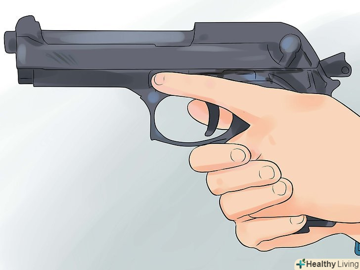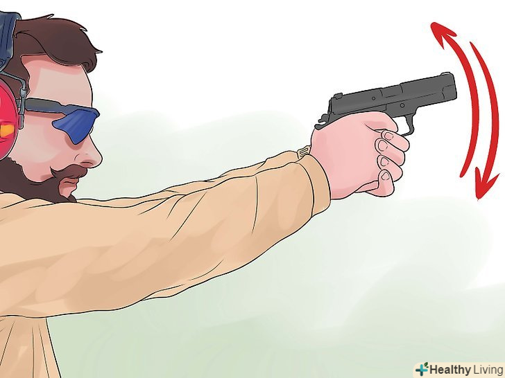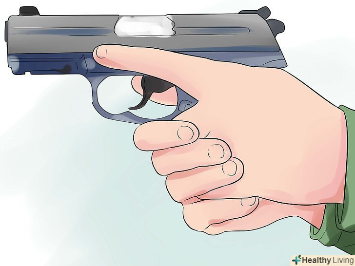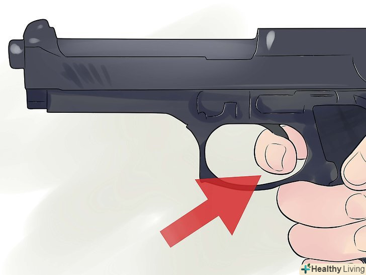 Натисніть на спусковий гачок. коли ви готові до стрільби, зніміть зброю з запобіжника і покладіть палець на спусковий гачок. Різкий ривок за спусковий гачок призведе до сильного підкидання руки, тому на спусковий гачок потрібно натискати плавно.