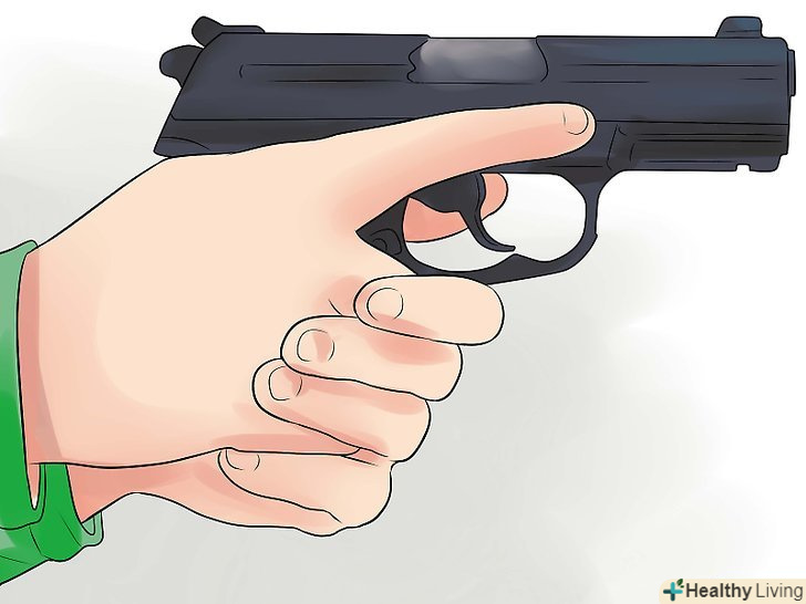 Тримаємо зброю в положенні готовності до стрільби. відкрийте долоню вашої робочої руки (рука, якою ви пишете) так, щоб великий і вказівний палець були спрямовані один від одного. Візьміть зброю іншою рукою і вкладіть його рукоятку в долоню робочої руки між великим і вказівним пальцями. Обхопіть рукоятку великим пальцем з одного боку, а середнім і безіменним пальцями і мізинцем з іншого боку відразу під запобіжною скобою.- Насправді, рукоятку зброї охоплюють тільки середній і безіменний пальці, тоді як Мізинець просто "спочиває" на ній. Хват рукоятки повинен бути міцним. Обхопіть рукоятку так міцно, як при рукостисканні, коли ви хочете щось комусь довести. Якщо хват такий сильний, що зброя трясеться в руках, послабте його трохи для припинення трясіння.
