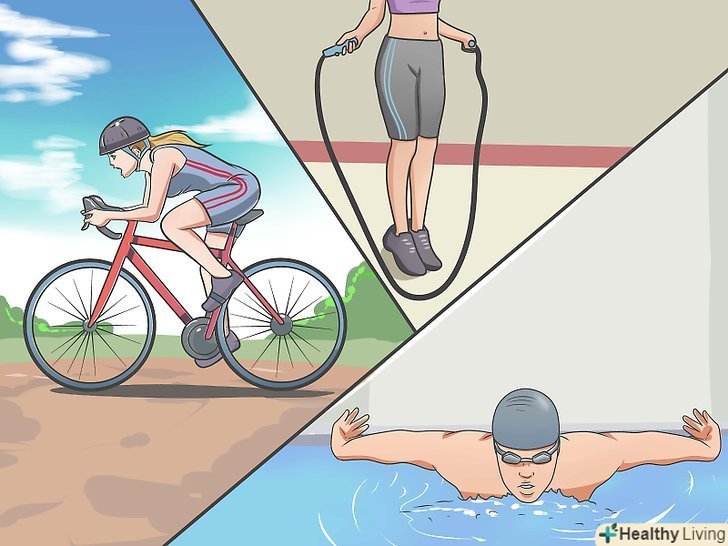 Міняйте вправи. якщо кожен день виконувати одне і те ж вправу протягом цілої години, можна дуже легко «вигоріти». Щоб зберегти настрій і підтримувати інтерес, необхідно урізноманітнити тренування. [18] поєднуючи вправи на опір з кардиоупражнениями, ви будете підтримувати прискорене серцебиття і вам не буде нудно займатися. Кардіотренування означають, що ваш пульс буде підвищуватися до 70-85 % від вашого максимального серцевого ритму і залишатися на такому рівні протягом тривалого періоду часу. Це означає, що в 60-хвилинну кардіотренування можна додати будь-який рух, включаючи присідання або віджимання.- Включіть кілька інтервалів, що складаються з віджимань, ситапів (вправ на прес), випадів, присідань, Берпі, стрибків на місці зі зміною положення рук і ніг, і перемикайтеся на ходьбу, довгі прогулянки, їзду на велосипеді, плавання, катання на ковзанах, біг підтюпцем, ходьбу по сходах або танці.
