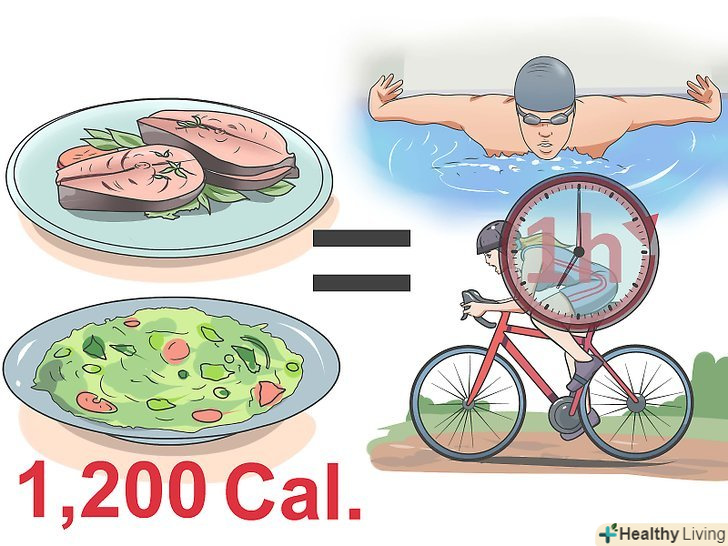 Скоротіть кількість споживаних калорій. якщо ви кожен день просто будете спалювати приблизно на 500 калорій більше, ніж споживаєте, це може привести до втрати 0,5–1 кг за тиждень. [4] підраховуючи калорії, ви зможете більш точно порівнювати, скільки ви щодня споживаєте і скільки спалюєте під час тренування.- Проте існує певне обмеження щодо того, яку кількість калорій можна урізати, не завдаючи шкоди здоров'ю. Наприклад, якщо ви плануєте займатися спортом по одній годині в день заради швидких результатів, вам все ще варто щодня споживати хоча б 1200 калорій — не менше. [5] для порівняння: в основному добова норма становить 2000 калорій.