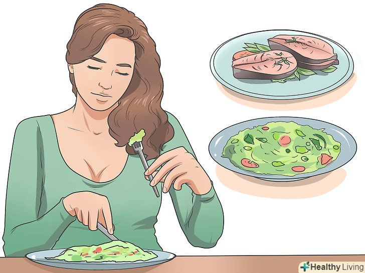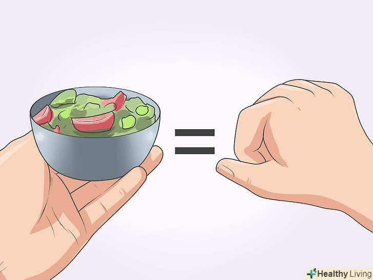 Контролюйте розміри порцій. деякі люди помилково вважають, що якщо є дуже багато корисних продуктів, то це все одно піде на користь організму. Однак, навіть якщо ви добре харчуєтеся, вам все ще необхідно контролювати розміри порцій. Щоб отримати краще уявлення про правильні розміри порцій, коли мова йде про здорове харчування, візьміть до уваги наступне: [8]- Розмір порції складних вуглеводів, таких як овочі, зернові та фрукти, повинен бути величиною з ваш кулак;