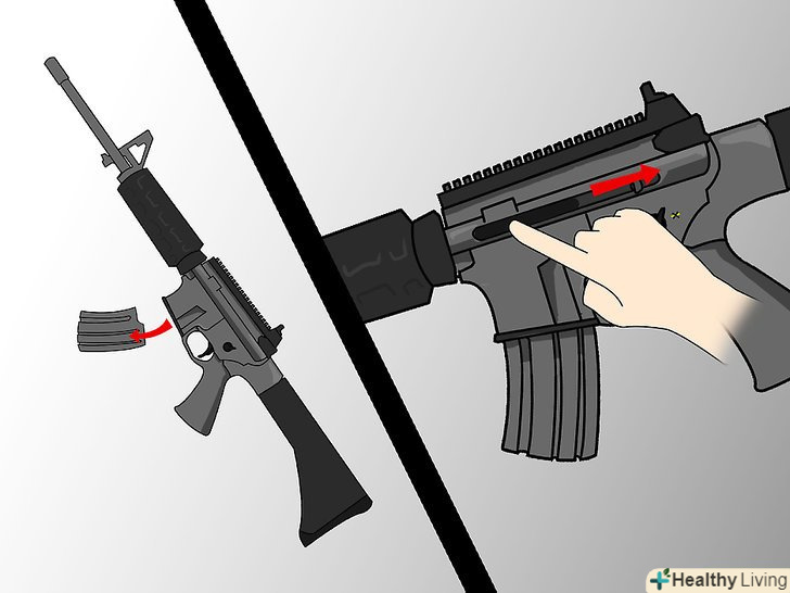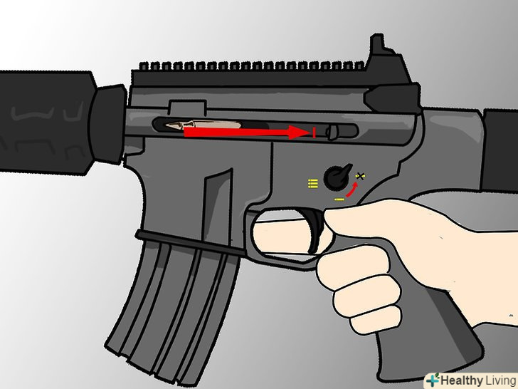 Щоб підготувати зброю до вогню, пересмикніть затвор. потягніть важіль затвора на себе, а потім відпустіть, і патрон з магазину потрапить в стовбур і буде там зафіксований. Якщо ви не збираєтеся стріляти відразу після цього, обов'язково поставте зброю на Запобіжник. Торкайтеся до спускового гачка тільки коли ви готові до вогню.