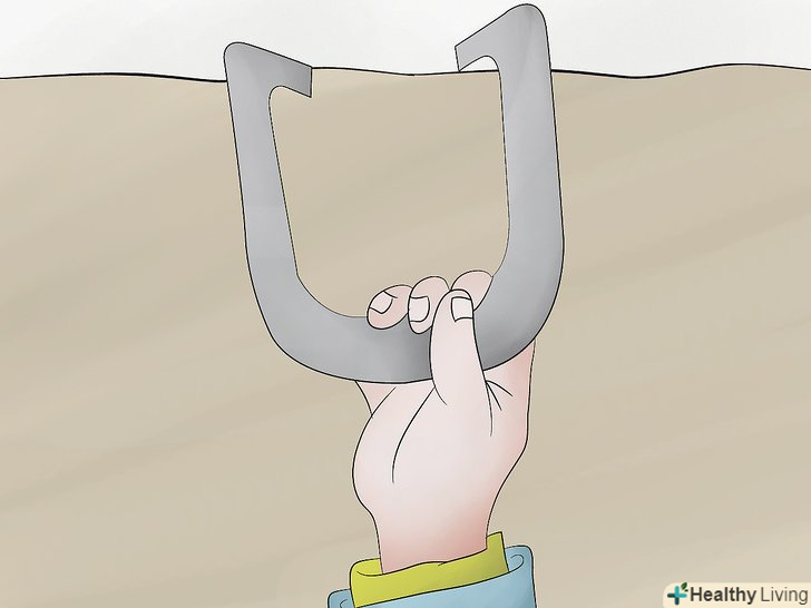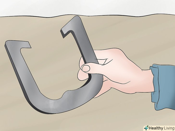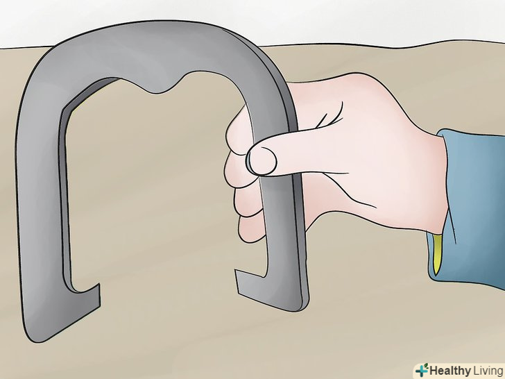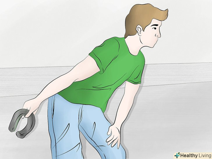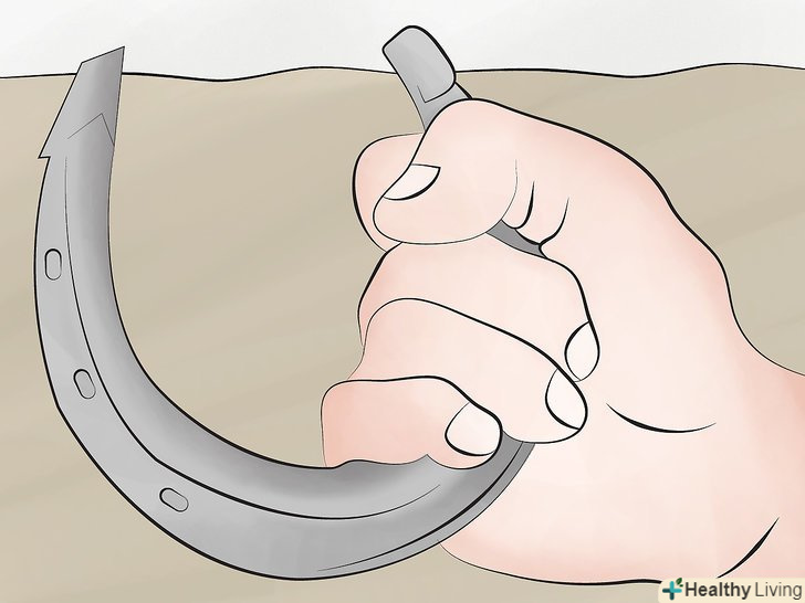 Міцно тримайте підкову. не потрібно дуже міцно стискати підкову, щоб Ваше зап'ястя не напружувалося, однак варто тримати підкову досить міцно, щоб вона не вислизнула занадто рано з вашої руки. Для початку, під час тренувань використовуйте легшу підкову, якщо у вас болить рука. [10] Use a lighter horseshoe to practice if your hand feels sore or painful.
