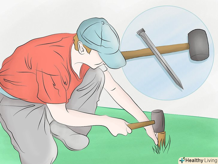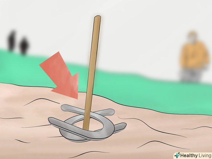 Вбийте два кілочка в землю. використовуйте молоток, щоб загнати кілочки в землю, по одному на кожному кінці поля. Нахиліть їх приблизно на 12º один до одного. Для постійного поля дли гри в "Метання підкови" використовуйте довгі, залізні стовпчики близько 36 дюймів (91 см) в довжину і 1 дюйм (2,5 см) в діаметрі. Або використовуйте будь-які довгі кілочки, в ідеалі ті, від яких після того, як їх увіб'ють в землю на поверхні залишиться 15 дюймів (38 см). [1]- 12º – це приблизно 1/8 шляху від вертикального положення до горизонтального.