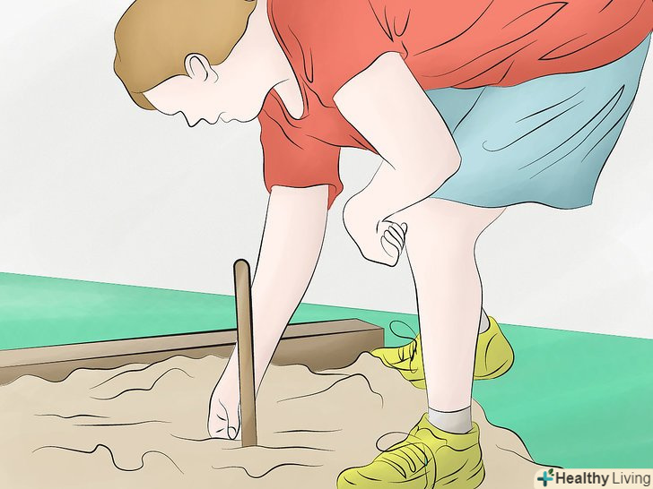 Покращіть поле (за бажанням). ви можете пропустити цей крок і почати грати без зволікання або використовувати ці загальні методи для поліпшення стабільності і сталості вашого поля. Якщо ви хочете звести до мінімуму кількість відхилень і рикошетів підкови, ви можете всипати невелику кількість мокрого піску або вологої глини навколо кожного кілочка. Щоб кілочки стояли твердо, вкопайте колоду з діркою для кілочка в землю. [2]