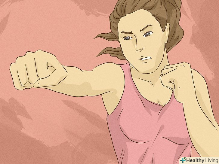 Бийте свого супротивника. перше, що вам потрібно зробити, це направити свій кулак. Щоб удар був ефективним, стисніть чотири своїх пальця в кулак, а великий палець розмістіть зверху - не всередині кулака, щоб не зламати його. Ударте противника в ніс або живіт, щоб завдати йому серйозної шкоди. Простий прямий удар добре підійде для початківців бійців. Він виконується наступним чином:- Тримайте руку перед обличчям, згинаючи її в лікті під кутом 30-45 градусів.