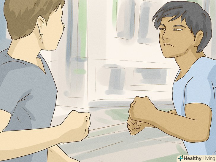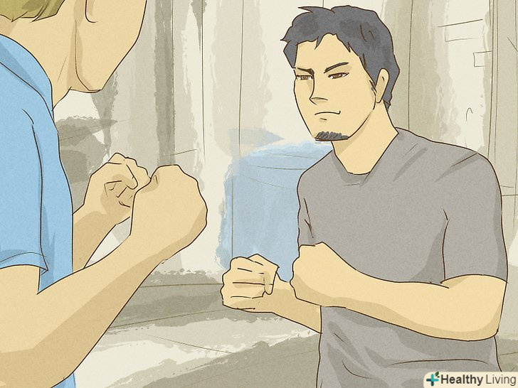 Займіть бойову стійку. Якщо ви збираєтеся битися, вам потрібно зайняти бойову стійку. Для цього, поставте ноги на ширині плечей, і трохи зігніть їх в колінах. Вам потрібно тримати баланс, щоб вас було важко звалити на землю. Будьте маневреними. Робіть невеликі кроки вправо-вліво, і тримайте руки перед обличчям, щоб захищатися.- Стискайте зуби — таким чином у вас буде менше шансів отримати перелом щелепи, отримавши удар в обличчя.