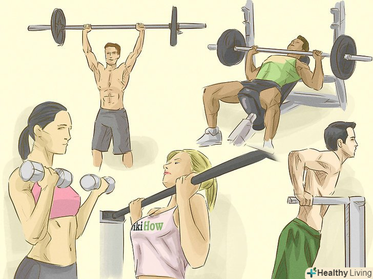 Додайте вправи для верхньої частини тіла. щоб наростити м'язову масу у верхній частині тіла, необхідно включити в тренування різноманітні вправи на роботу м'язів грудної клітини і рук. Використовуйте великі ваги і робіть знижене число повторень при виконанні цих вправ: [14]- Жим штанги над головою;