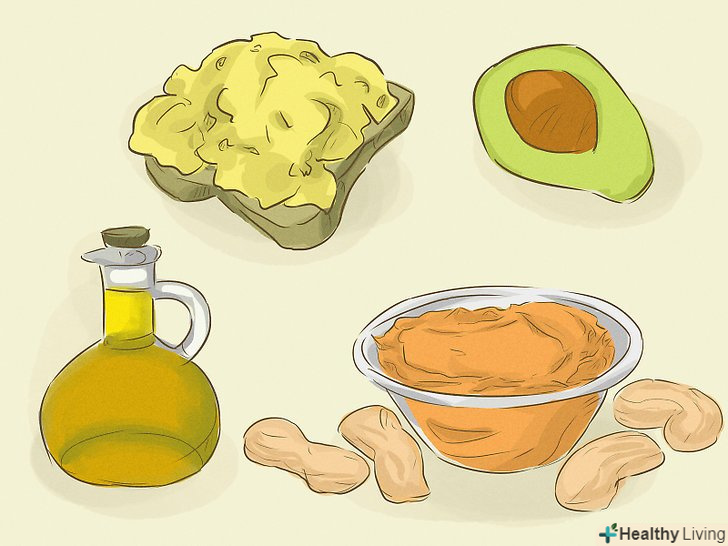 - Поливайте оливковою олією продукти або кладіть шматочок вершкового масла в їжу після приготування. Додавайте авокадо в салат або з'їдайте його з омлетом вранці. Втручайте арахісове масло в Протеїнові коктейлі або використовуйте його в якості перекусу в другій половині дня.