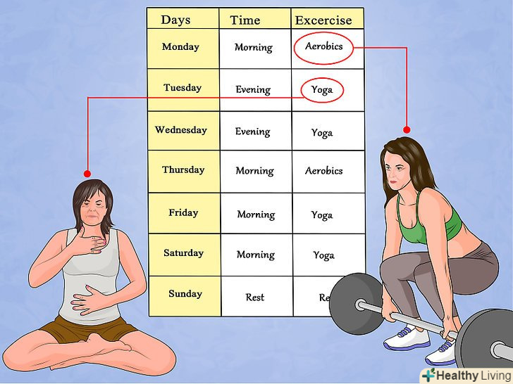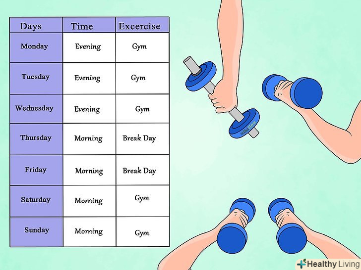 Урізноманітніть види вправ. ви зможете натренувати всі групи м'язів свого тіла, якщо протягом тижня будете виконувати різний спектр вправ. Після того як ви натренуєте свої м'язи по цій стратегії, вони повинні будуть відпочити протягом 48 годин. Ваші м'язи ростуть, коли ви відпочиваєте, а не коли піднімаєте тяжкості. [1]