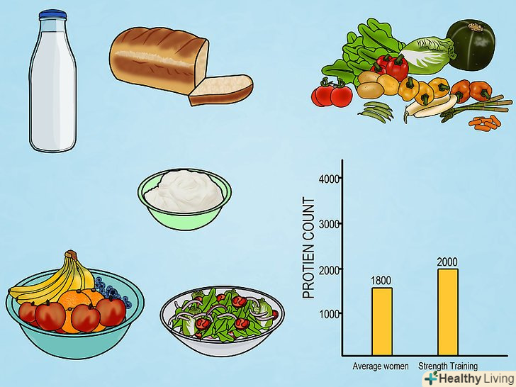 Правильно харчуйтеся. споживайте достатню кількість калорій і враховуйте, скільки ви скидаєте під час тренувань. Жінкам рекомендується споживати від 1800 до 2000 калорій на день. Якщо ви спалюєте від 300 до 500 калорій протягом тренування, вам потрібно їсти більше протягом дня. [4]