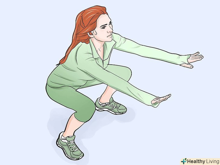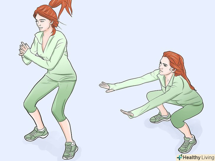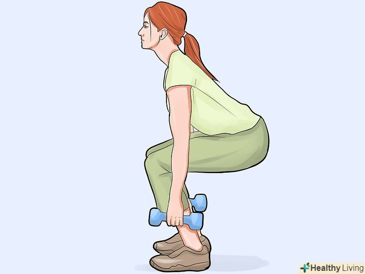 - Зігніть ноги в колінах і присідайте, поки ваші стегна не стануть паралельно до підлоги.