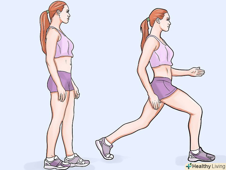 Робіть крокуючі випади. під час цих вправ працюють м'язи сідниць, квадрицепси і біцепси стегна і через деякий час ви зможете наростити м'язову масу і округлити ваші ноги.- Зробіть великий крок вперед однією ногою.